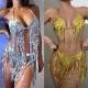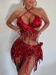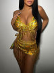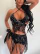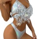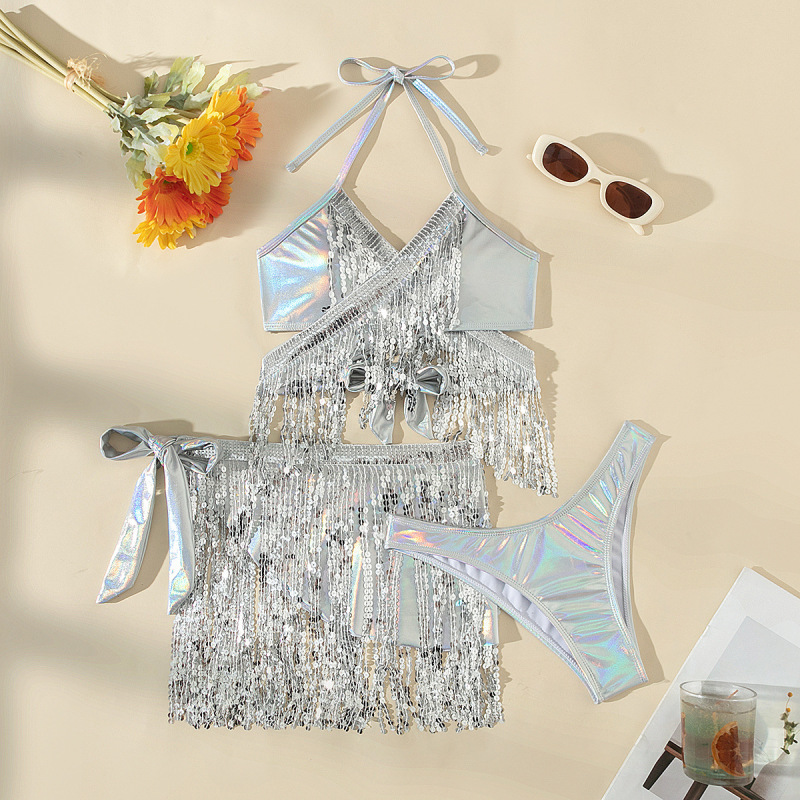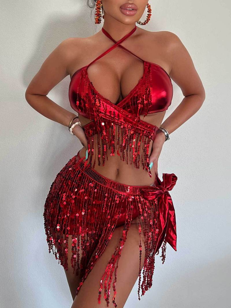3-Piece Sequin Fringe Bikini Set Burning Man Festival Swimwear for Women, Glitter Halter Top High-Cut Bottom Sheer Cover-Up (S–L, Iridescent White / Gold / Black / Red)