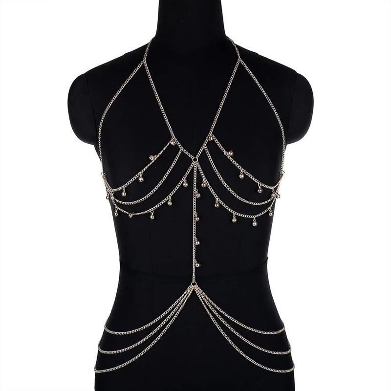 Gold Bell Layered Body Chain Multi-Strand Alloy & Pearl Harness Jewelry for Festival, Rave, Beach, EDC, Burning Man